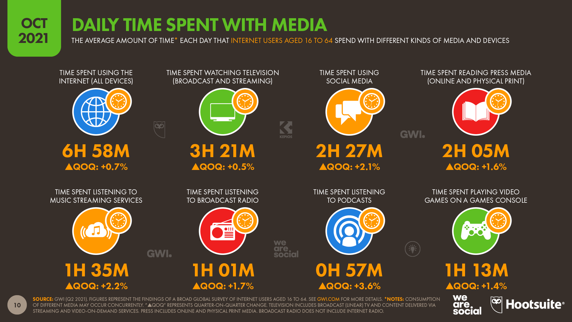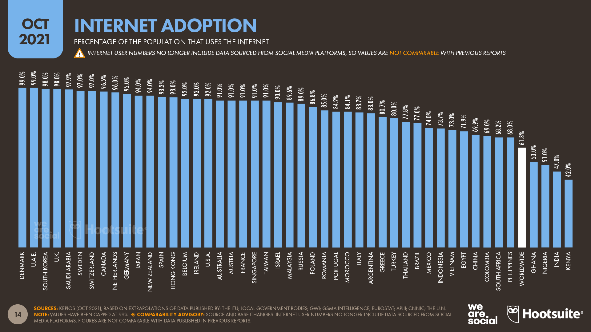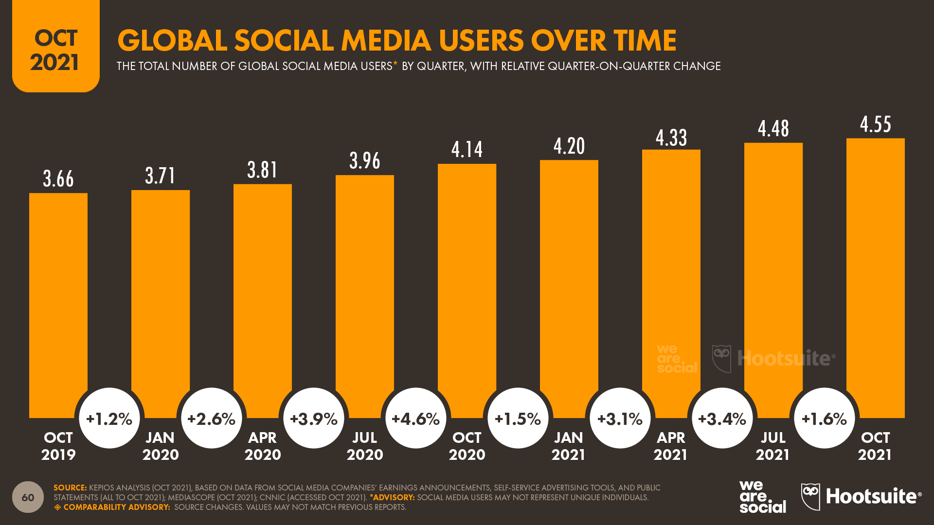 - کاربران رسانه های اجتماعی در 12 ماه گذشته بیش از 400 میلیون (+9.9٪) افزایش یافت و در اکتبر 2021 به 4.55 میلیارد رسید. رشد کاربران در 3 ماه گذشته اندکی کند شده است ، اما کل جهان همچنان در حال افزایش است نرخ بیش از 1 میلیون کاربر جدید هر روز. در مقایسه با زمان مشابه سال گذشته نرخهای رشد کنونی نشان میدهد که جمعیت جهان تا اواسط سال 2023 از 8 میلیارد نفر فراتر خواهد رفت.
