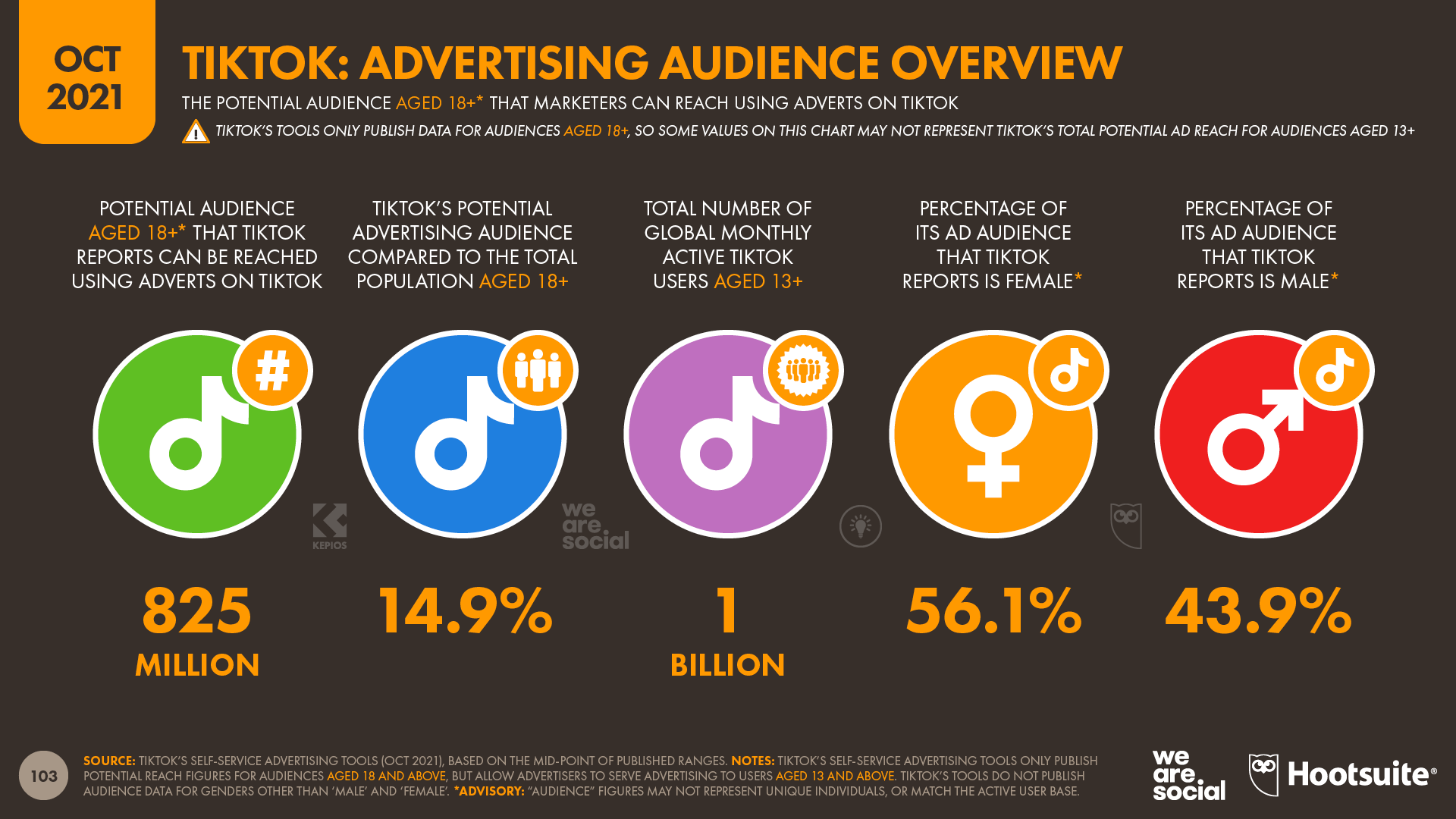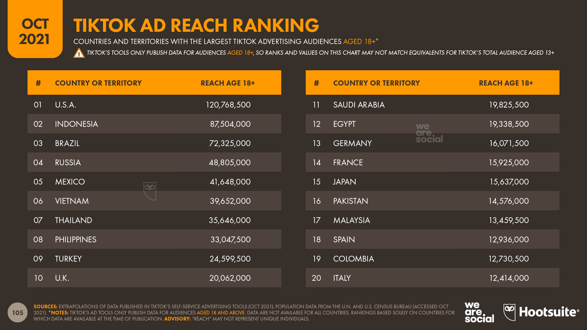 توجه: ابزارهای TikTok برای هر گروه سنی رقم دسترسی کلی را که کمی بیشتر از مجموع ارقام جداگانه آن است ، گزارش می دهند. گزارشات مربوط به کاربران زن و مرد در هر گروه سنی مربوطه ، به همین دلیل آمارها به 100٪ نمی رسد. تبلیغات TikTok اکنون به بیش از 120 میلیون کاربران آمریکایی 18 ساله و بالاتر می رسد. برای مرجع، این فقط 20٪ کمتر از 150 میلیون کاربر آمریکایی 18 ساله و بالاتر است که بازاریابان می توانند با استفاده از تبلیغات در اینستاگرام به آنها دسترسی پیدا کنند. کل جمعیت ایالات متحده در همان محدوده سنی، اگرچه کاربران جوان تر که سن خود را نادرست نشان می دهند ممکن است تا حدودی این نسبت را تغییر دهند. کاربران اندونزی 18 ساله و بالاتر. برزیل سوم است ، با بیش از 72 میلیون کاربر در همان گروه سنی.