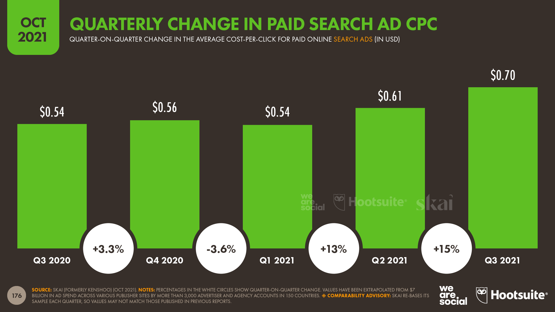 هزینه تبلیغات دیجیتال جهش می کند آخرین داده های Skai (کنشو سابق) نشان می دهد که هزینه رسیدن به مخاطبان در رسانه های اجتماعی طی 12 ماه گذشته به میزان قابل توجهی افزایش یافته است. بیش از 33 درصد از این زمان در سال گذشته است. می خواهند تا کنون و تا پایان سال قیمتهای بسیار بالاتری را مهیا کنند. البته عملکرد گذشته همیشه شاخص قابل اعتمادی برای روندهای آینده نیست ، اما اگر امسال شاهد چنین روندی باشیم ، بازاریابان نباید از دیدن متوسط CPM های رسانه های اجتماعی به 9 دلار در 3 ماه گذشته متعجب شوند. در سال 2021. الگوی مشابه تورم هزینه تبلیغات در تبلیغات جستجو نیز مشهود است ، به طوری که Skai افزایش 30 درصدی سالانه در میانگین هزینه جستجوی جهانی (CPC) را در مقایسه با سال قبل گزارش کرده است. مشابه آخرین روند رسانه های اجتماعی، CPC های جستجو در سه ماهه سوم 2021 در حال حاضر بسیار بالاتر از میانگین CPC در سه ماهه "تعطیلات" سال 2020 (Q4) بوده است، که نشان می دهد ممکن است در ماه های آینده شاهد هزینه های بالاتر مرتبط با تبلیغات جستجو باشیم.