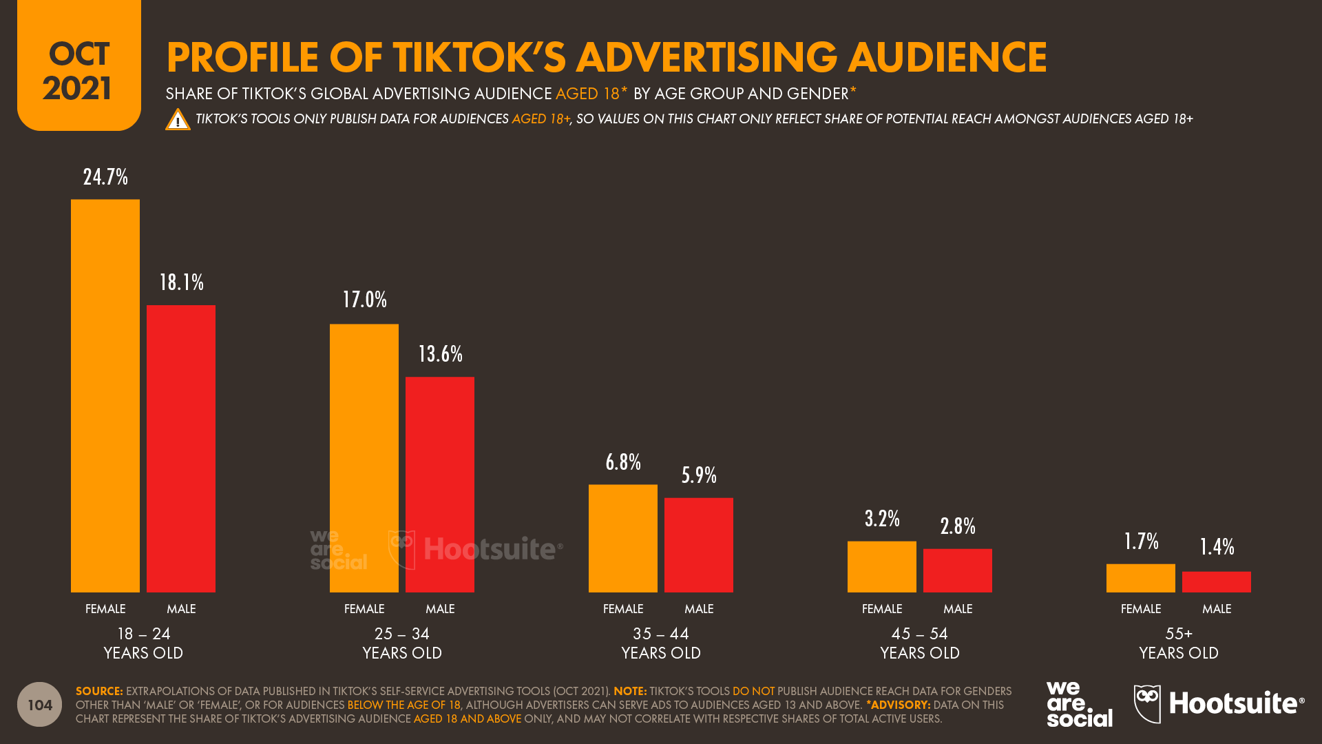 با این حال ، همانطور که در داده های سایر سیستم عامل ها مشاهده می کنیم ، دسترسی TikTok از نظر جغرافیایی و جمعیتی بسیار متفاوت است. مخاطبان TikTok بر اساس جنسیت به عنوان مثال ، داده های خود شرکت نشان می دهد که 56.1 درصد از تبلیغات جهانی TikTok جالب اینجاست که این نشان دهنده «تغییر» نسبت جنسیتی فیس بوک است که در آن کاربران مرد 56.5 درصد از مخاطبان تبلیغات جهانی را تشکیل می دهند. جمعیت جمعیتی در هند ، جایی که مردان بیش از 75 درصد از 350 میلیون کاربر فعال ماهانه این پلتفرم را به خود اختصاص می دهند. توجه: TikTok داده های مخاطبان را برای جنسیت های دیگر به غیر از "زن" یا "مرد" گزارش نمی کند. به همین دلیل است که ما فقط می توانیم تقسیمات جنسیتی دوتایی را گزارش دهیم. تبلیغات برای کاربران بین سنین 13 تا 17 سال با این حال ، داده های موجود به وضوح از این فرضیه حمایت می کند که TikTok به ویژه در میان کاربران جوان محبوبیت بیشتری دارد. به طور خاص ، کاربران 18 تا 24 ساله تقریباً 45 درصد TikTok را تشکیل می دهند. جهانی a در میان کاربران 18 ساله و بالاتر. علاوه بر این، زنان در این گروه سنی تقریباً یک چهارم از کل مخاطبان تبلیغاتی این پلتفرم را در سنین 18 سال و بالاتر تشکیل می دهند. برای سهم بیشتری از مخاطبان تبلیغاتی TikTok نسبت به کاربران با هر جنسیتی 35 ساله و بالاتر.
