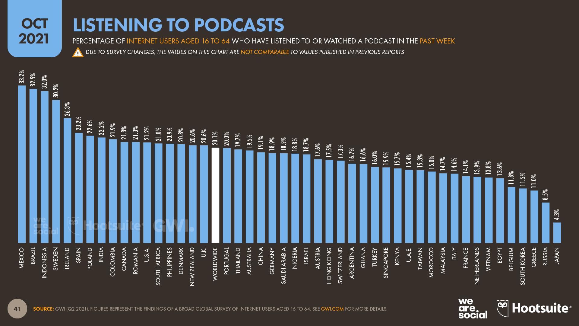 محبوبیت پادکست ها افزایش می یابد آخرین تحقیقات از GWI نشان می دهد که بیش از 1 نفر از هر 5 کاربر اینترنت 16 تا 64 ساله در سراسر جهان اکنون هر هفته به یک پادکست گوش می دهند.