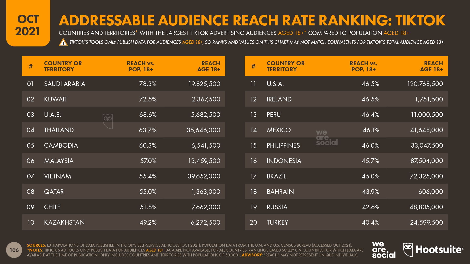 با این حال ، وقتی به دسترسی TikTok در مقایسه با افراد محلی نگاه می کنیم. ما شروع به کشف برخی از یافته های جالب تر می کنیم. به عنوان مثال ، TikTok به نظر می رسد در خاورمیانه بسیار محبوب است. تعداد کاربران TikTok در عربستان سعودی تقریباً 80 of از کل جمعیت کشور است. در سنین 18 سال به بالا ، و پایگاه کاربران محلی این پلت فرم در حال حاضر به طور قابل توجهی بزرگتر از فیس بوک یا اینستاگرام است. به بیش از دو سوم از کل بزرگسالان 18 سال و بالاتر. این پلتفرم همچنین در سراسر آسیای جنوب شرقی بسیار محبوب است، با ارقام دسترسی به تبلیغات TikTok برابر با بیش از 6 نفر از هر 10 بزرگسال بالای 18 سال در تایلند و کامبوج. ، و بیش از نیمی از آن گروه سنی در ویتنام و مالزی.