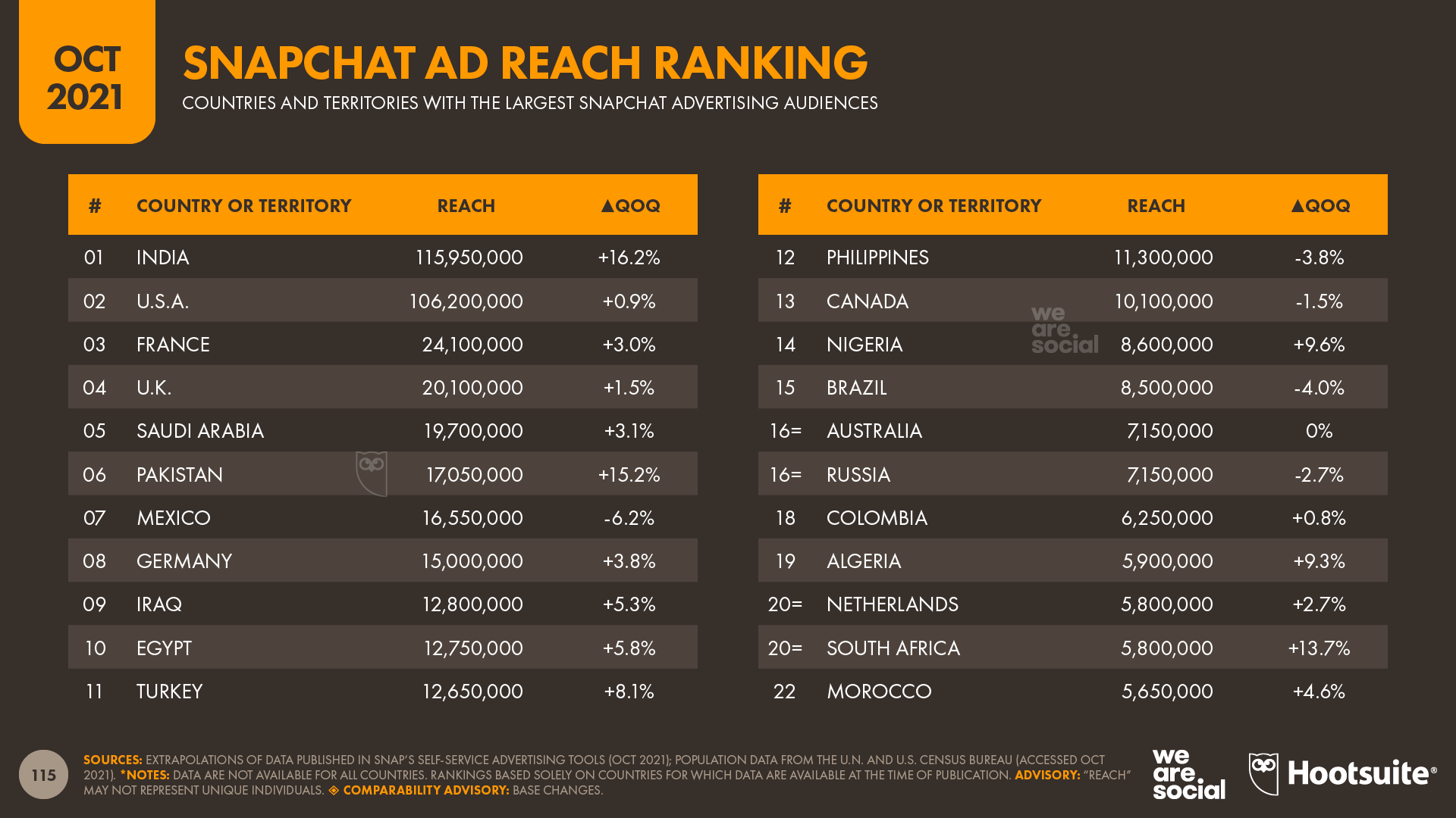 هند در حال حاضر بیش از 21 of از کل مخاطبان تبلیغات جهانی Snapchat و تقریباً 29 accounts را به خود اختصاص داده است. از بین مخاطبین مرد جهانی این پلتفرم. جالب اینجاست که کاربران مرد تقریباً 60 درصد از مخاطبان تبلیغات Snapchat در هند را تشکیل می دهند ، در حالی که میانگین جهانی مردان فقط کمتر از 45. است. Snapchat رشد سالمی در تبلیغات جهانی داشته است. در سه ماهه گذشته نیز، 24 میلیون کاربر جدید از گزارش آمار جهانی ژوئیه 2021 دیجیتال ما افزوده شد تا مجموع تبلیغات جهانی پلت فرم به 59458 میلیون برسد. .