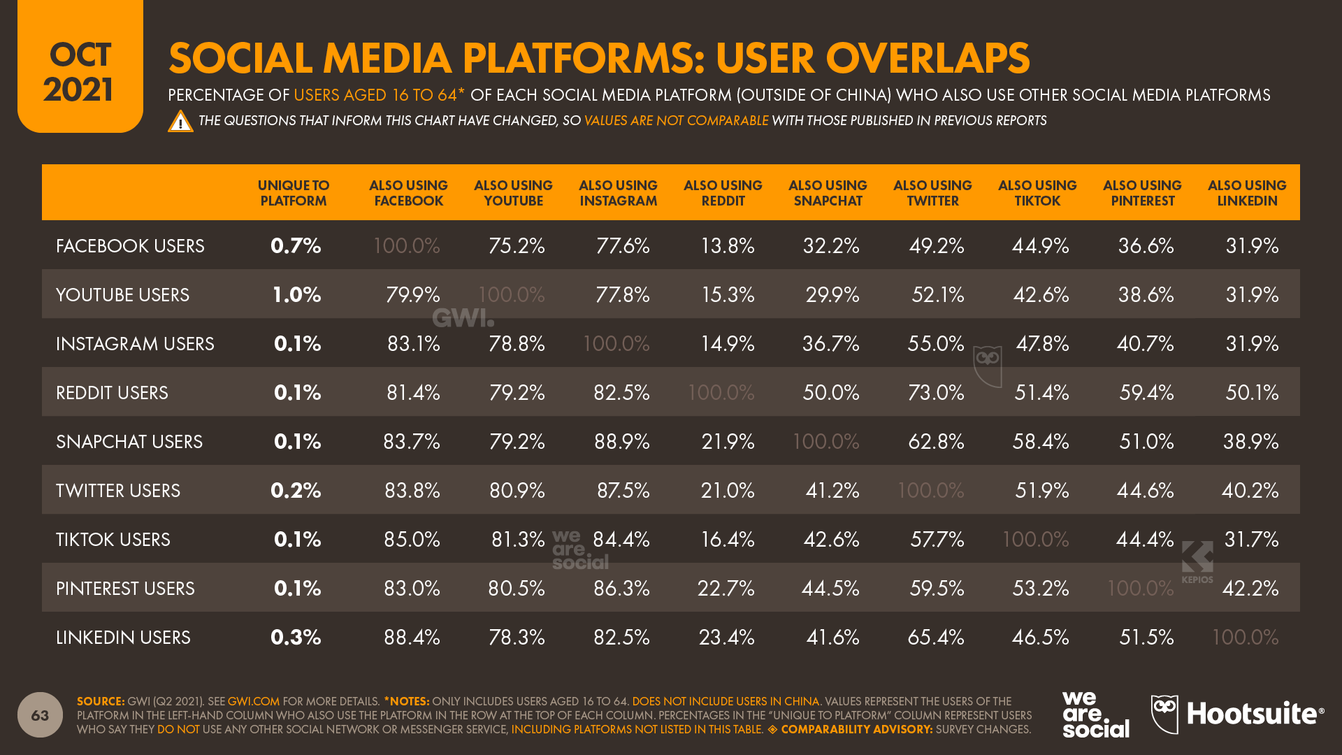 را ارائه می دهد. بدون شمارش دوبار شمارش در بالا توضیح داده شد. با این حال ، داده های شرکت نشان می دهد که بیش از 600 میلیون کاربر فعال اینستاگرام از استفاده نمی کنند از فیس بوک استفاده می کنند ، که برجسته است ارزش رویکرد نمونه کارها Facebook Inc. آخرین داده های GWI داستان کمی متفاوت را نشان می دهد ، با میزان بیشتر همپوشانی در سیستم عامل ها. با این حال ، شایان ذکر است که دادههای GWI بر روی کاربران اینترنت 16 تا 64 ساله در مجموعهای از اقتصادهای بزرگتر جهان تمرکز دارد.